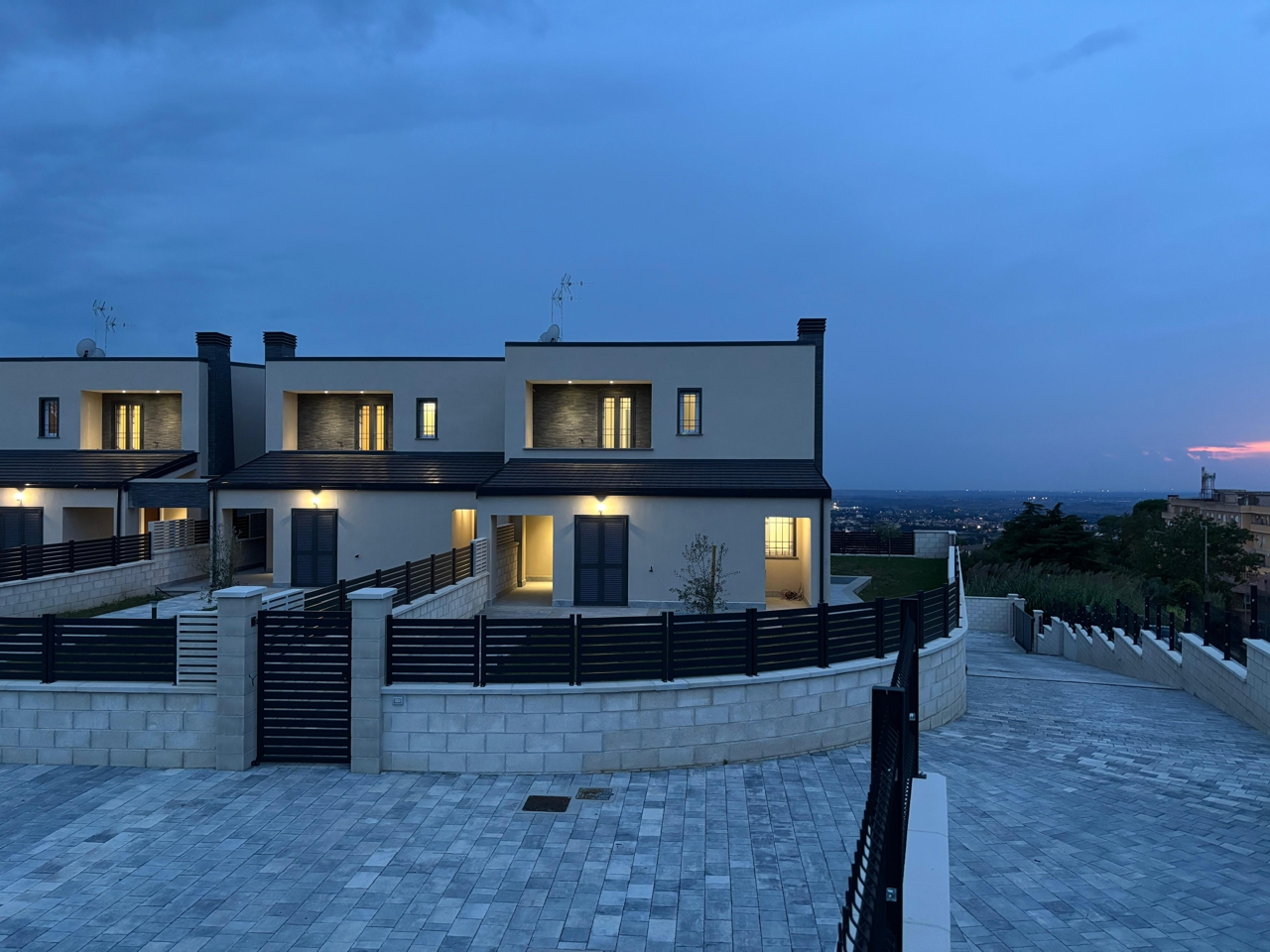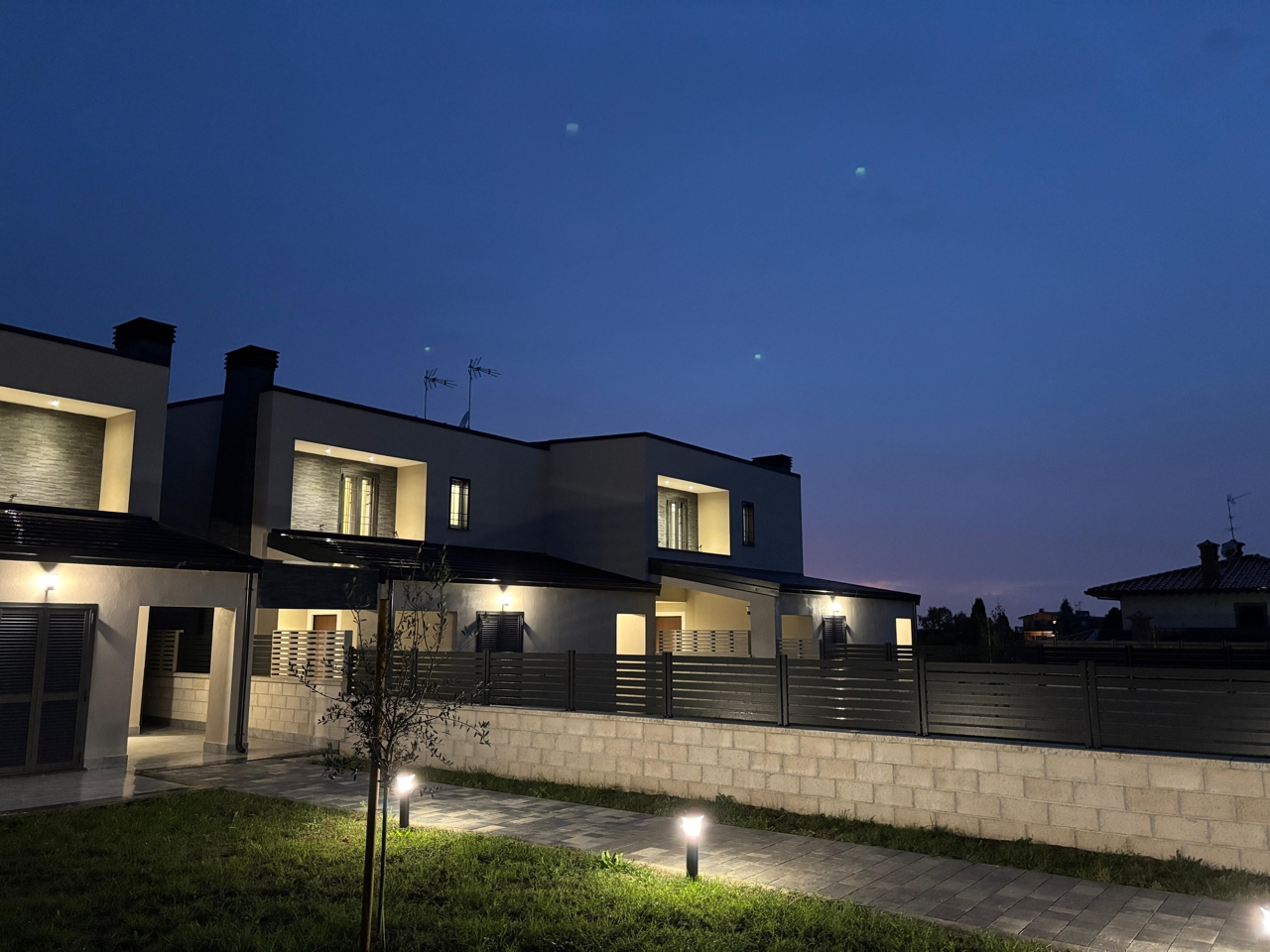 Il progetto ha previsto la realizzazione di ampie aree esterne private, recinzioni in blocchi faccia a vista, vialetti carrabili e pedonali in porfido grigio, oltre a predisposizioni impiantistiche complete per il massimo della funzionalità.