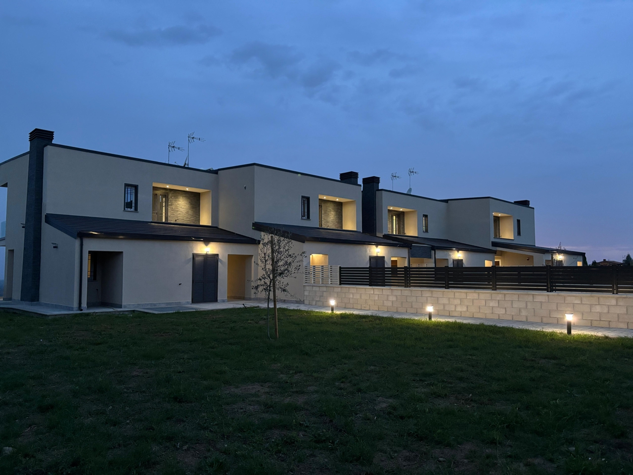 Le ville si distinguono per il loro design contemporaneo, caratterizzato da linee pulite, volumi ben definiti e finiture moderne. I prospetti alternano intonaci chiari a rivestimenti materici, con parapetti in vetro, coperture in tegole scure e infissi in alluminio che valorizzano l’estetica e garantiscono durabilità e comfort.